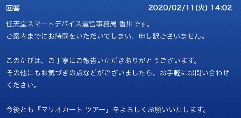 【マリオカートツアー】CPUアイテム不正使用動画に対する運営の返答キターーーー!!! 2020年02月13日 カテゴリ:運営お知らせ 175: 名無しですよ、名無し!(茸) (スフッ Sd43-/blJ [49.104.4.109]) 2020/02/11(火) 19:03:57.99 ID:u9N0c0Nad 例のCPUアイテム不正使用動画に対する運営の返答 【【マリオカートツアー】CPUアイテム不正使用動画に対する運営の返答キターーーー!!!】の続きを読む タグ :#マリカー#マリオカートツアー#マリカツ#運営#CPU#不正#おつおつさん